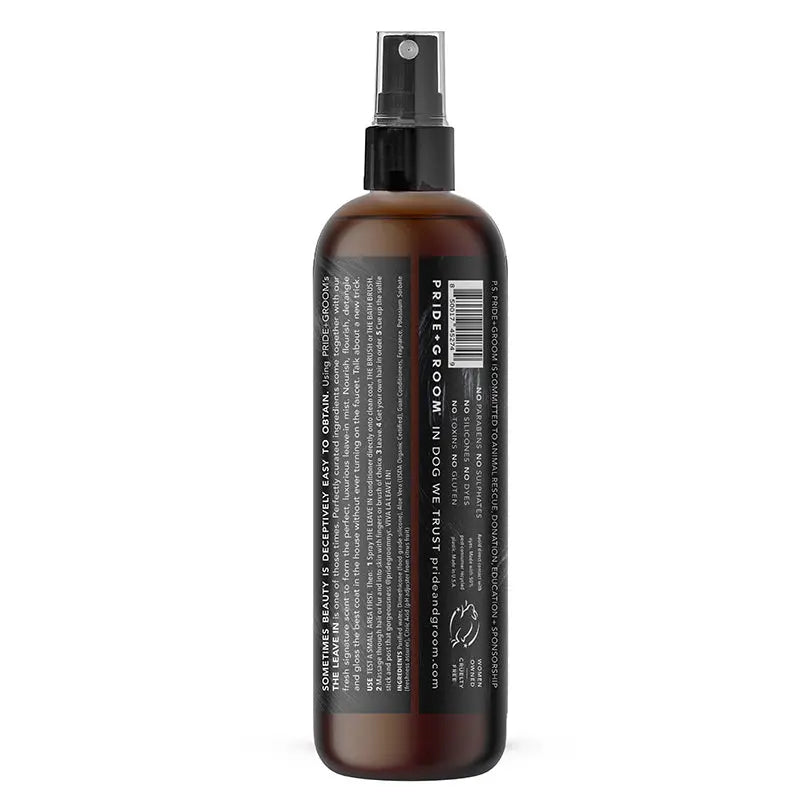 THE LEAVE IN Conditioner is a reparative, detangling, and ultra de-matting spray for dogs & cats that benefits all coat types and hair lengths. This shine-inducing spray can be applied to wet or dry pet hair to produce stunning results that improves with every use. No rinsing necessary.